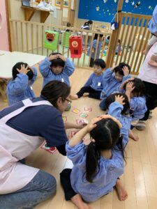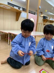 その後、2歳児クラスのお友だちは「ふくわらい」や簡単な「カルタ」を楽しみました!