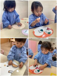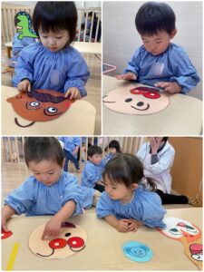福笑いではパーツを持って目👀だったら自分の目に当てたり、お口のパーツを口に当ててお友達と笑い合っていました✨笑顔が絶えないクラスです🤭