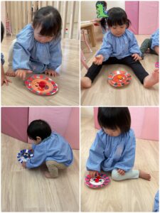 コマ回しにも挑戦しました!!最初は保育者がまわしているところをじーっと観察する子どもたちでしたが、いつの間にかやり方をマスター👏👏回すと絵柄がキラキラして大興奮でしたよ💕
