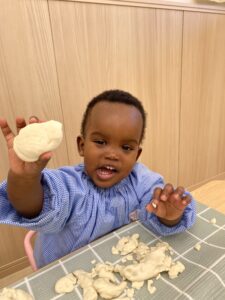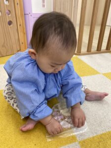 はじめて小麦粉粘土に触れる0歳児さん。