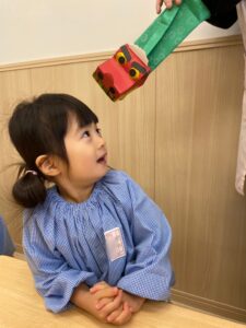 上手にお返事できたお友だちは獅子舞さんから頭をカプッとするプレゼントが😂