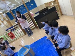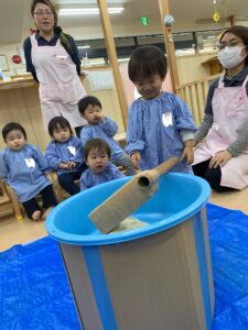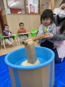 最近園でよく歌っている、みんな大好きな「もちつき」の歌を元気いっぱいに歌って、気持ちを盛り上げた後は…。