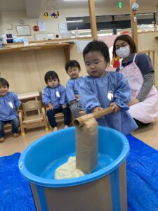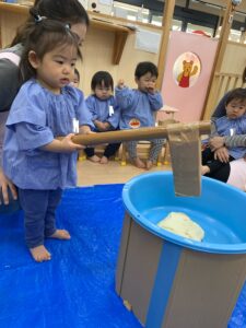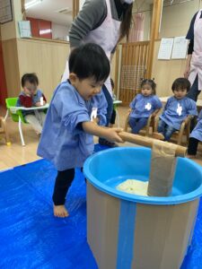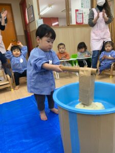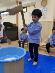 一歳児さんも、杵をひとりで持ってぺったんこと出来ました!みんなきりりとしたかっこいいお顔です🥰