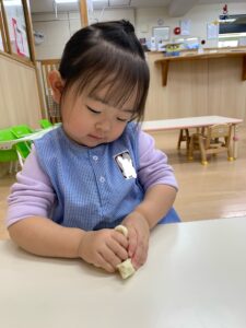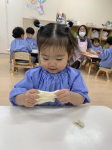 もちもちとした手触りが気持ちよくって、こねこねしたり、ちぎったり丸めたりと思い思いに楽しむ姿が見られました☺️
