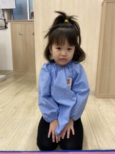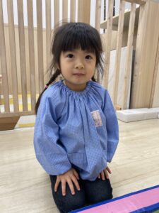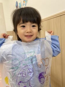 ビニール袋の取っ手を肩に付けて「エプロンみたーい🌟」と見せてくれました😊