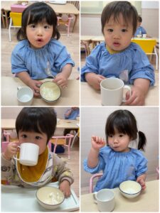 コップ飲みができるようになったもも組さんのお友達✨できる事がたくさん増えて嬉しいね☺️