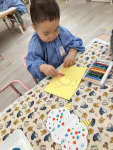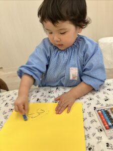 みんなで鬼の角を作るために黄色い画用紙にクレヨンで模様を描きました🖍️