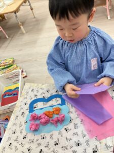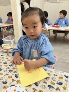 2歳児さんは鬼の髪になる所に好きな色のお花紙を丸めてペタペタと貼りました。「次はこの色にしようかな」と好きな色の花紙を選びながらくしゃくしゃと丸めたくさん貼ってくれ素敵な髪の毛ができました☺️