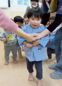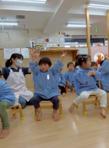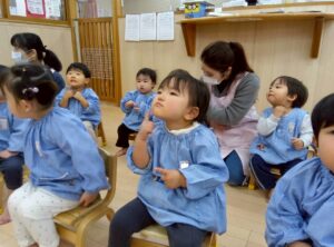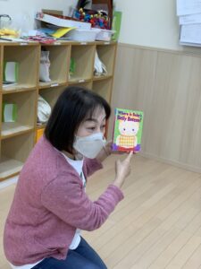 eyes(目)、mouth(口)、cheek(頬)などの体のパーツを教えてもらい、曲に合わせて自分の体に指差しチャレンジ!