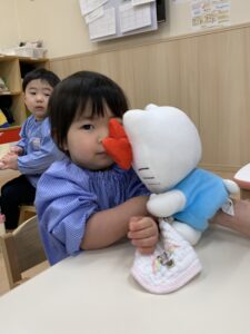 今日は「はーい」とお返事した後、キティちゃんに「ターッチ!」してみました。