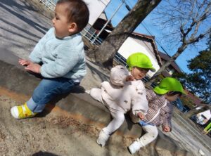 最近1歳児さんは、お散歩ロープを持って歩く練習を始めました。