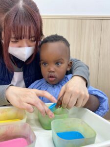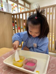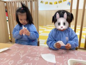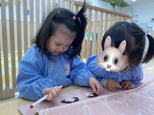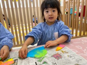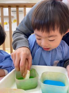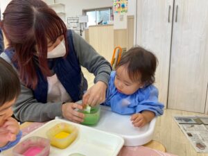 「これ!これ!」とみんなの製作を興味深く見ていた0歳児さんも先生と一緒に挑戦❣️