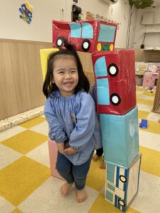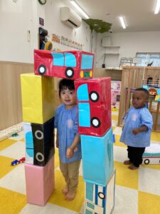 2歳児さんが楽しい遊びを考えてくれて1歳児さんもニコニコだね😆