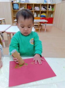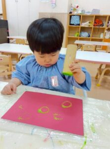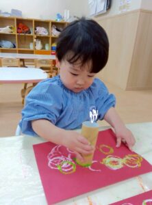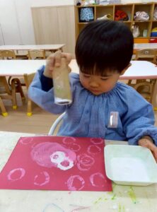 赤い画用紙に、ピンク.白.黄緑の三色の絵の具をポンポンポンとスタンプします。トイレットペーパーの芯を使って、たくさんの丸をスタンプしました!
