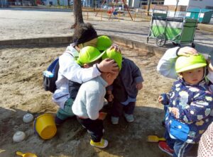 「地震だよ。お砂場の真ん中に集まって、ダンゴムシさんになるよ」という保育者の指示を、少し戸惑いながら守ることができました。あらゆる場面を想定して、今後も避難訓練をしていく予定です。