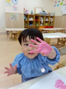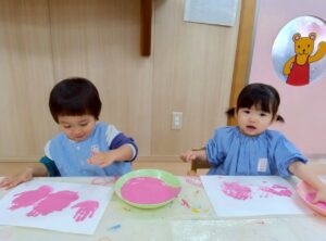 1歳児さんはピンクの絵の具で手形をペタペタ🖐️