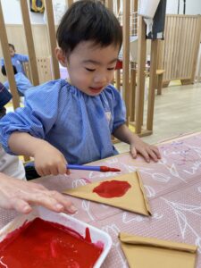 赤色の絵の具をピザソースに見立ててぬりぬり🎨