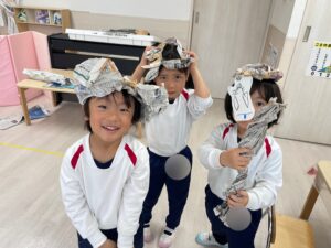 新聞紙遊びで帽子を作りました!