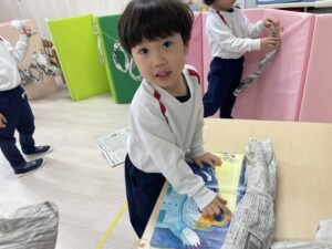 絵本を見ながら帽子作りに夢中の子どもたち🎩