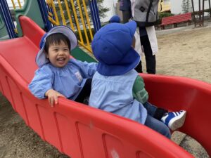 初めは先生に支えてもらったりしながら、恐る恐る登っていた2歳児さん達でしたが、コツを掴むと1人でも登ることができて「やったー!」「できたー!」ととても嬉しそうでした😄