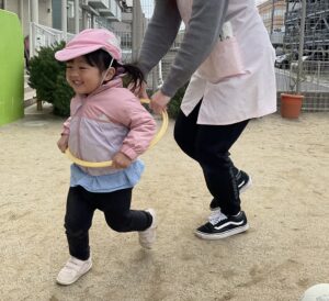 フラフープの中に入り電車ごっこです🚃「シュッシュ、ポッポ!」満面の笑みです💖