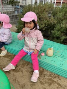 ポットにお茶を入れて、コップにお友達とお茶を注ぎあってティータイムを楽しんでいます🥰