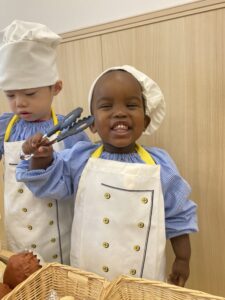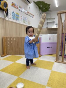2歳児のお姉さん達がかっこよく店員さんをしている姿を見て「ぼくも!」とやる気満々だった1歳児さん🌟
