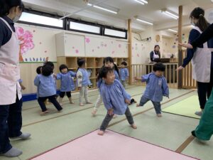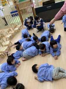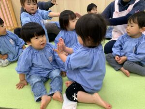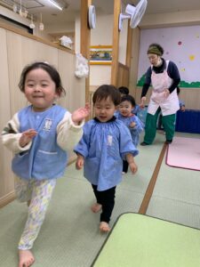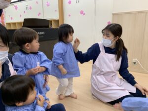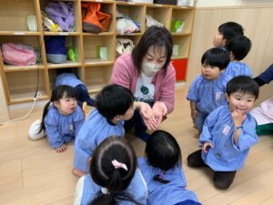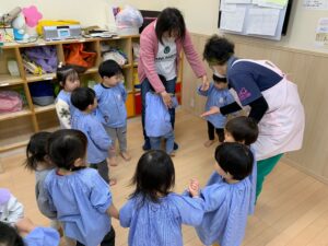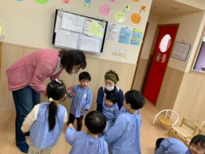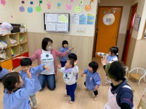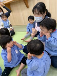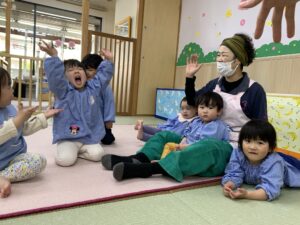 最近出席を取る時には「ここですよ〜♪」と音楽に合わせて手を振るのがお気に入りの子どもたち